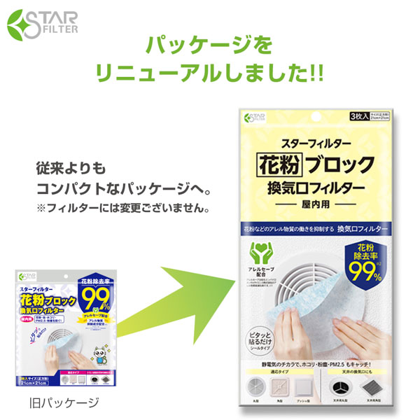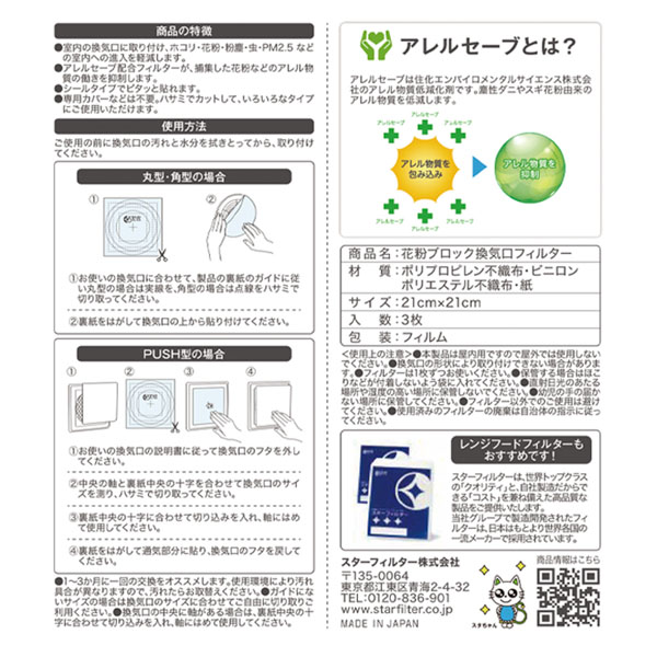 花粉ブロック 換気口フィルター PM2.5対応 アレルセーブ配合 1袋(3枚入)