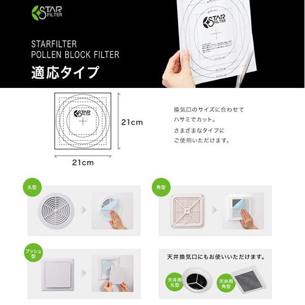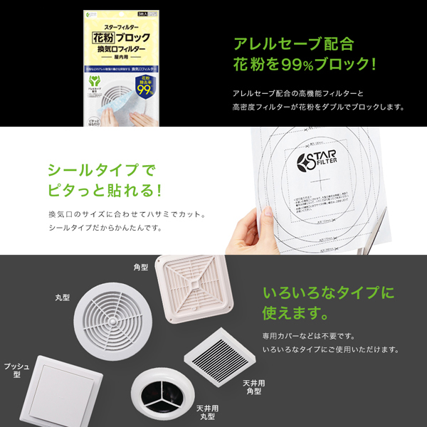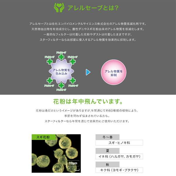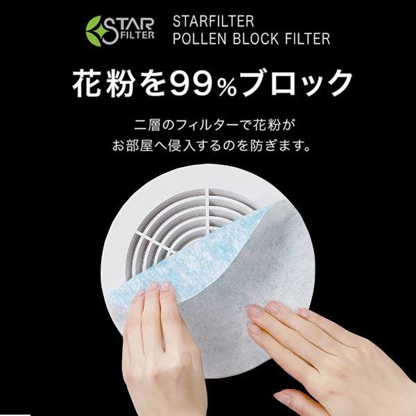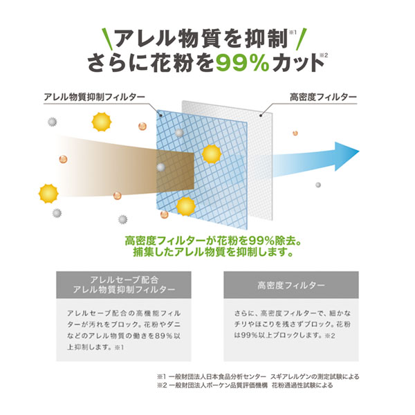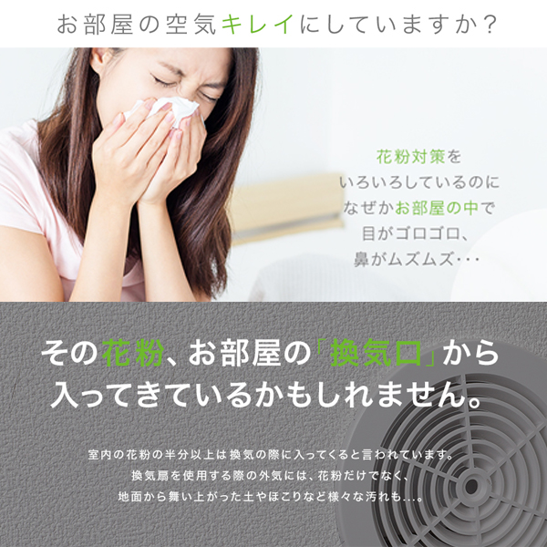 花粉を99%ブロックする屋内通気口フィルター。さらにアレルセーブ配合でアレル物質を低減化。