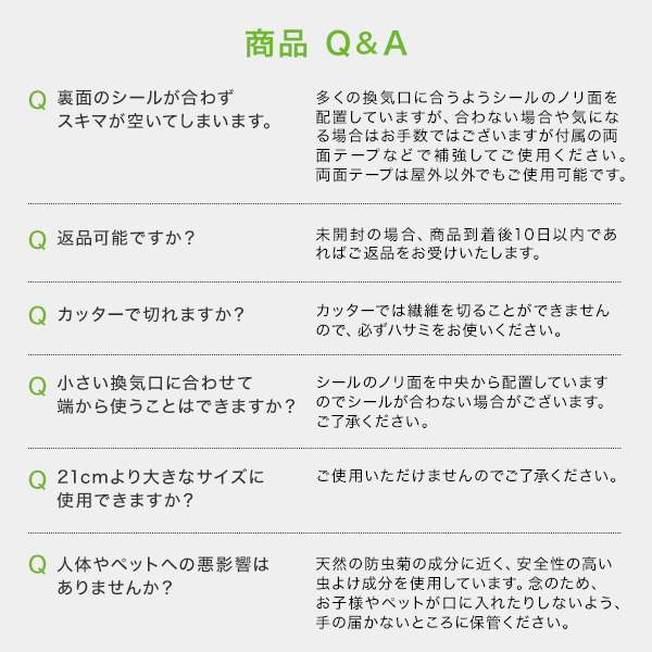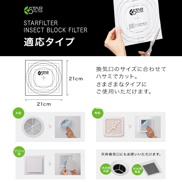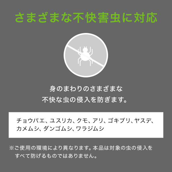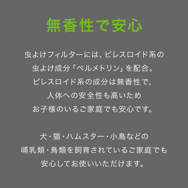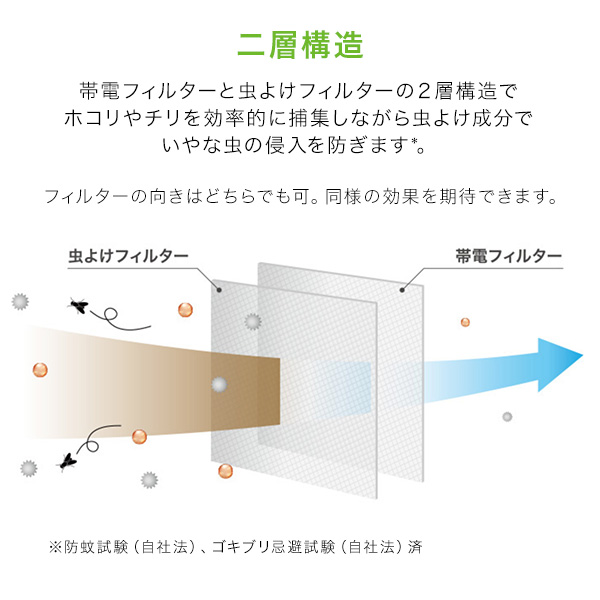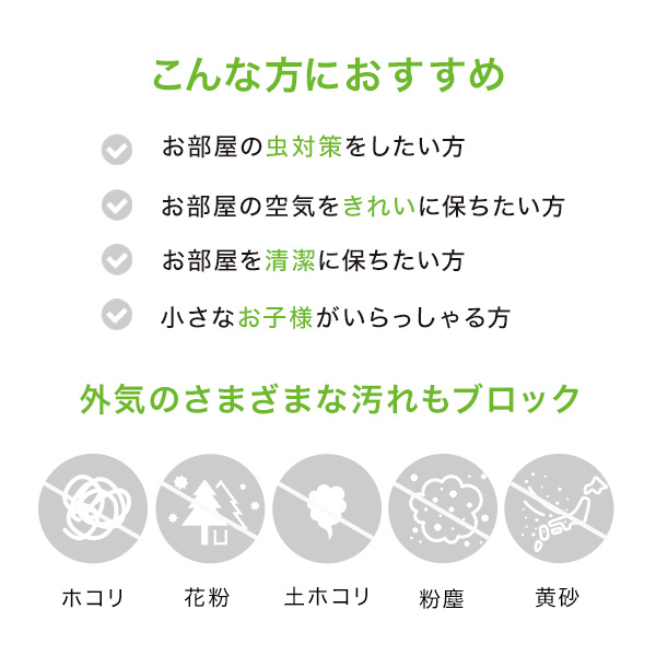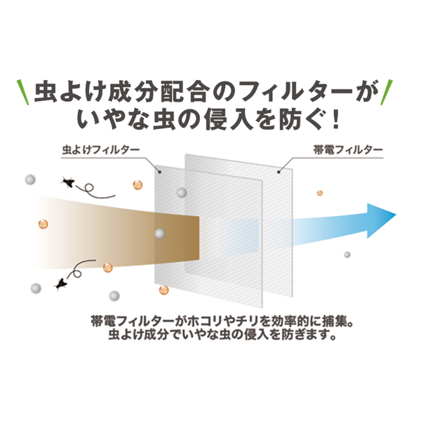 虫よけ成分によっていやな虫の侵入を防ぎながら、外から侵入する空気をキレイにします。