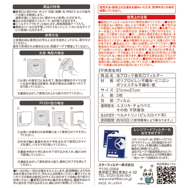 虫ブロック 換気口フィルター 虫よけ成分配合 1袋(3枚入)