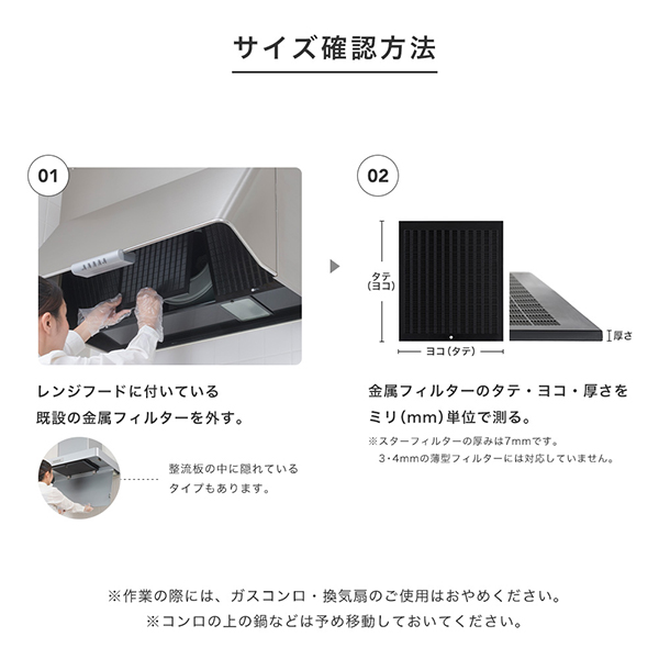 | ご使用上の注意 | ●一般家庭用レンジフードフィルター以外での使用はしないでください。 ●レンジフードフィルターは不燃性ガラス繊維を使用していますが、キャッチした油や埃に引火することがあります。長期間の使用による油分の堆積は危険ですのでご注意ください。 ●レンジフードフィルターの設置に際しては、各自治体が定めた火災予防条例における火源との距離を保持してください。 ●レンジフードフィルターは使い捨て商品です。洗浄して繰り返し使用するのは、ガラス繊維が飛び散る原因となりますのでご注意ください。 ●むやみに折ったり切ったりはしないでください。また、強い衝撃を与えないでください。 ●ガラス繊維が刺さった場合は、石けんとぬるま湯でもみ洗いしてください。それでも異常が残る場合は、医師に相談してください。 ●交換フィルターは直射日光や湿気の多い場所を避け、小児の手の届かない所に保管してください。 ●取り付けが不完全な場合は専用枠ごと落下する恐れがありますので、確実に取り付けられたか必ず確認してください。 |